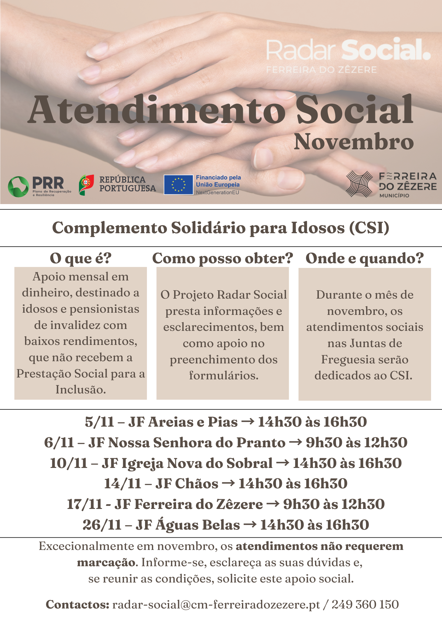 Irá realizar-se no dia 17 de novembro na Junta de Freguesia de Ferreira do Zêzere das 9h30 às 12h30, um atendimento social sobre o Complemento Solidário para Idosos.
