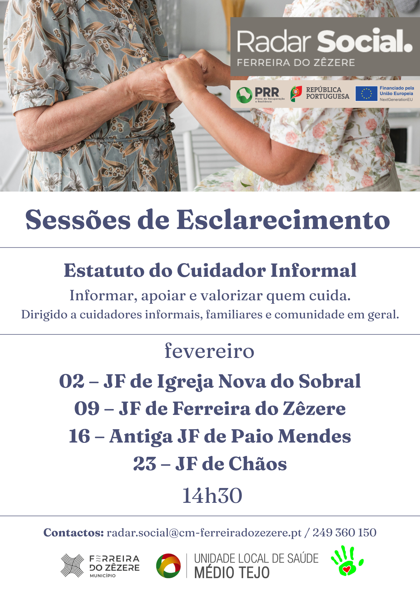 Informamos que no dia 9 de fevereiro, pelas 14h30, realizar-se-á na sede da Junta de Freguesia de Ferreira do Zêzere uma sessão de esclarecimento sobre o Estatuto do Cuidador Informal, promovida pelo Radar Social do Município de Ferreira do Zêzere.